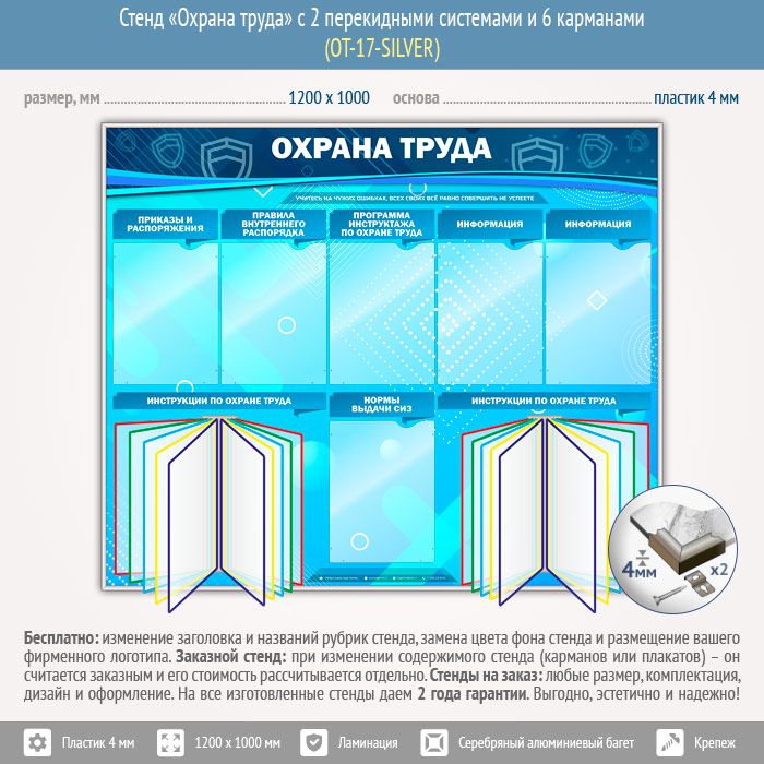 Стенд «Охрана труда» с 2 перекидными системами и 6 карманами (OT-17-SILVER) в Волгограде купить