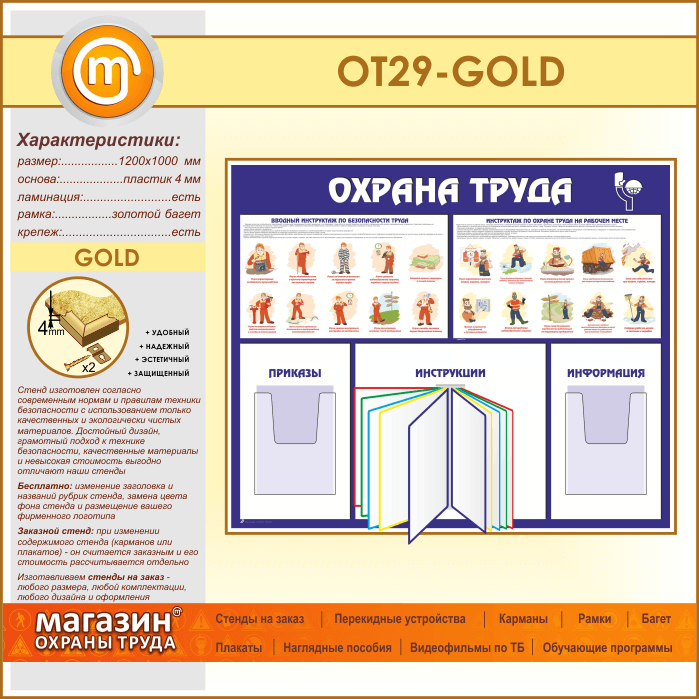 Стенд «Охрана труда» с перекидной системой и 2 объемными карманами (OT-29-GOLD) в Волгограде купить