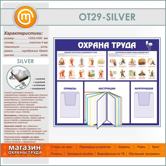Стенд «Охрана труда» с перекидной системой и 2 объемными карманами (OT-29-SILVER) в Волгограде купить