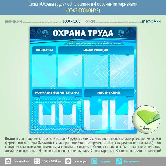 Стенд «Охрана труда» с 4 плоскими и 4 объемными карманами (OT-03-ECONOMY2) в Волгограде купить