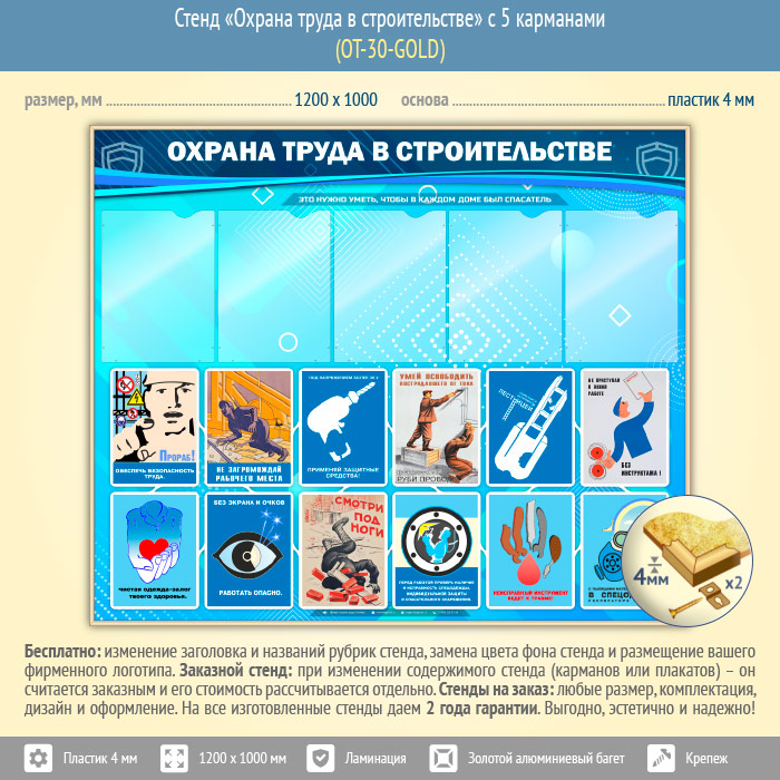 Стенд «Охрана труда в строительстве» с 5 карманами (OT-30-GOLD) в Волгограде купить