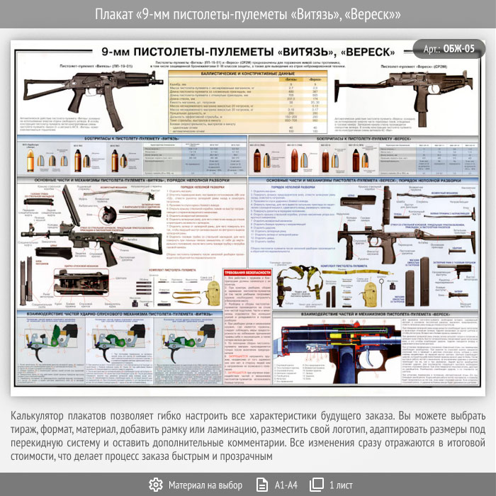 Плакат «9-мм пистолеты-пулеметы «Витязь», «Вереск»» (ОБЖ-05, 1 лист) в Волгограде купить