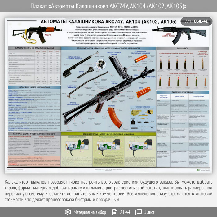 Плакат «Автоматы Калашникова АКС74У, АК104 (АК102, АК105)» (ОБЖ-41, 1 лист) в Волгограде купить
