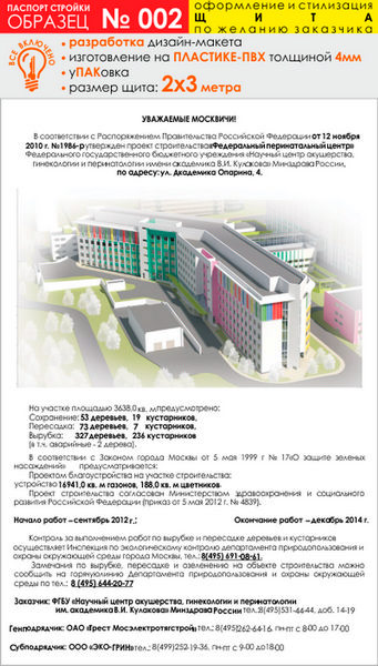 Предлагаем Вам изготовление паспорта стройки на баннерной ткани и ПВХ-пластике. В цену включены: разработка и согласование макета, изготовление и упаковка, а также НДС 18%. На данной странице представлены варианты материалов и размеров для образца № 2. Помимо представленных размеров мы можем изготовить паспорт объекта любого другого размера (цену уточняйте у менеджеров) и на любом материале (включая металл)