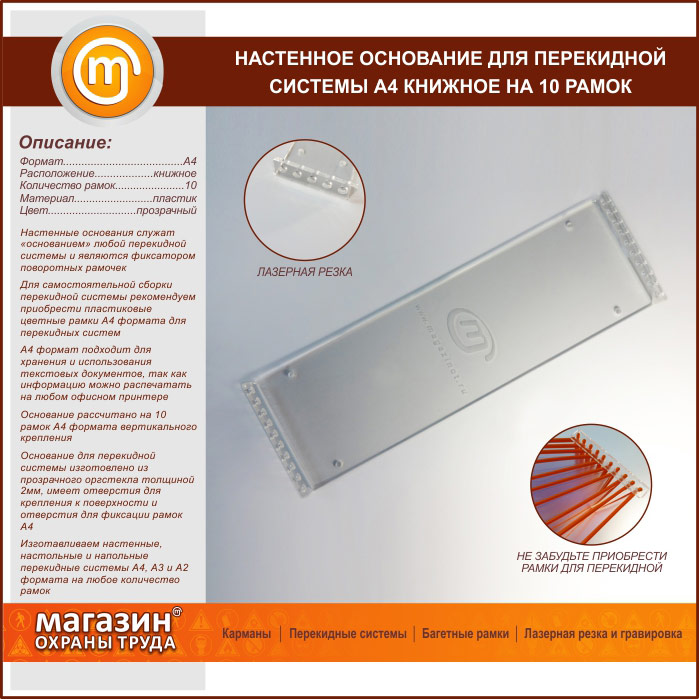 Настенное основание для перекидной системы А4 книжное на 10 рамок (оргстекло) в Волгограде купить