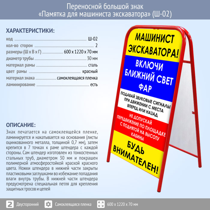Переносной большой знак «Памятка для машиниста экскаватора» (Ш-02, двусторонний, самоклеящаяся пленка) в Волгограде купить