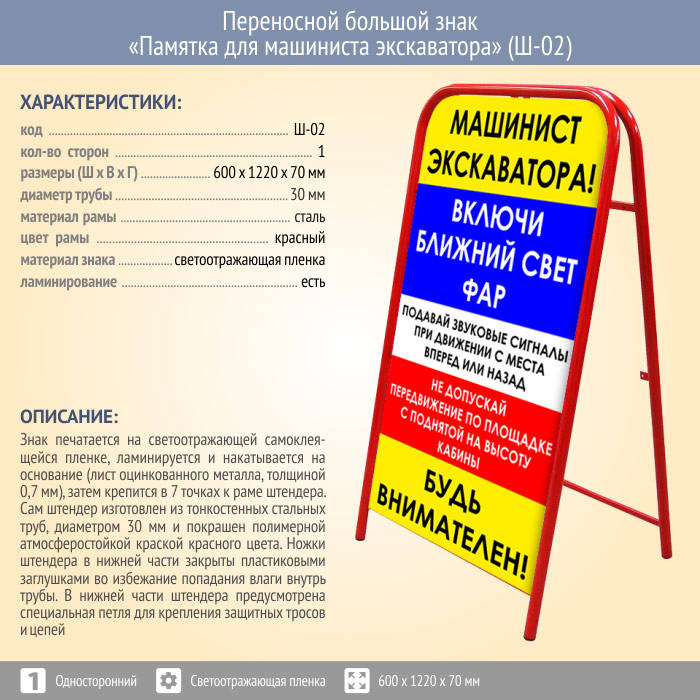 Переносной большой знак «Памятка для машиниста экскаватора» (Ш-02, односторонний, светоотражающая пленка) в Волгограде купить