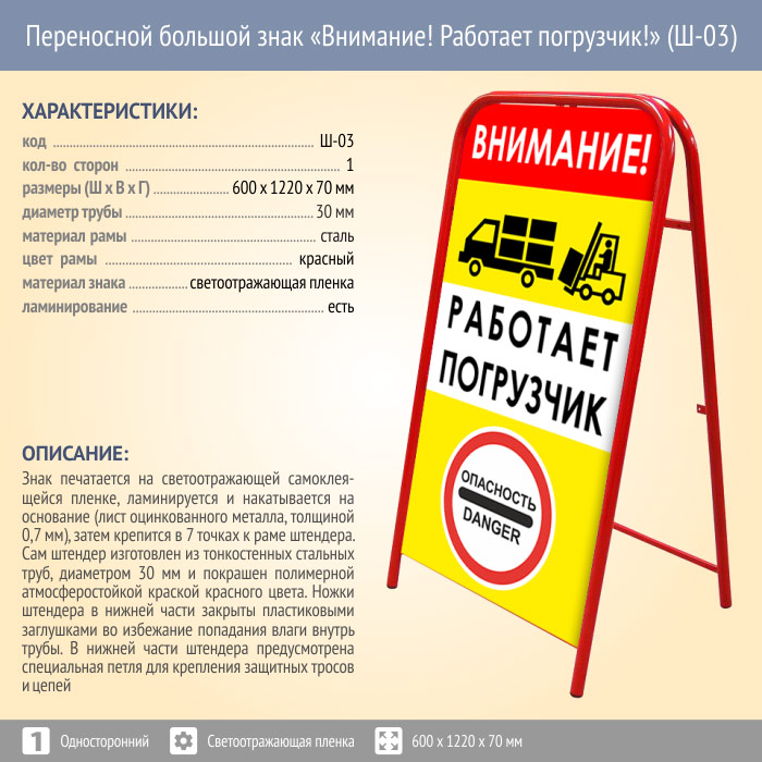 Переносной большой знак «Внимание! Работает погрузчик!» (Ш-03, односторонний, светоотражающая пленка) в Волгограде купить