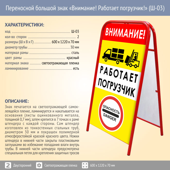 Переносной большой знак «Внимание! Работает погрузчик!» (Ш-03, двусторонний, светоотражающая пленка) в Волгограде купить