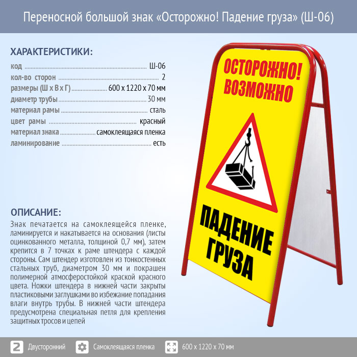 Переносной большой знак «Осторожно! Падение груза» (Ш-06, двусторонний, самоклеящаяся пленка) в Волгограде купить