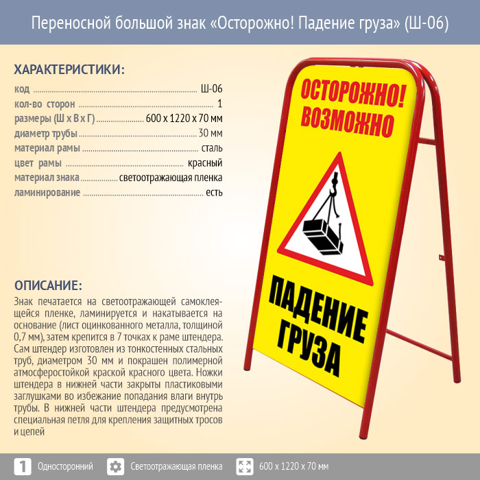 Переносной большой знак «Осторожно! Падение груза» (Ш-06, односторонний, светоотражающая пленка) в Волгограде купить