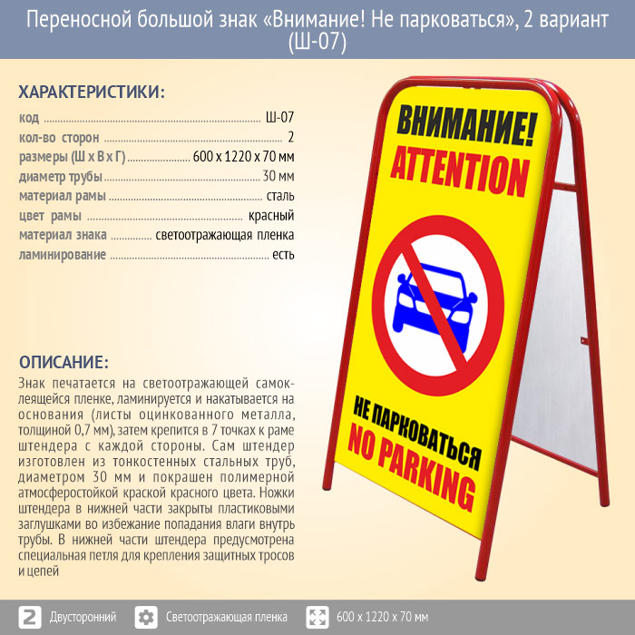 Переносной большой знак «Внимание! Не парковаться», 2 вариант (Ш-07, двусторонний, светоотражающая пленка) в Волгограде купить