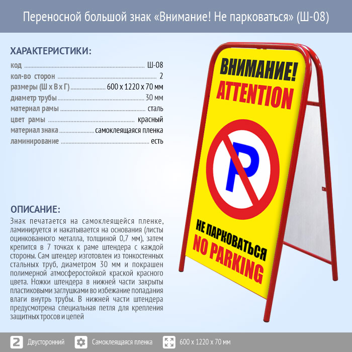 Переносной большой знак «Внимание! Не парковаться» (Ш-08, двусторонний, самоклеящаяся пленка) в Волгограде купить