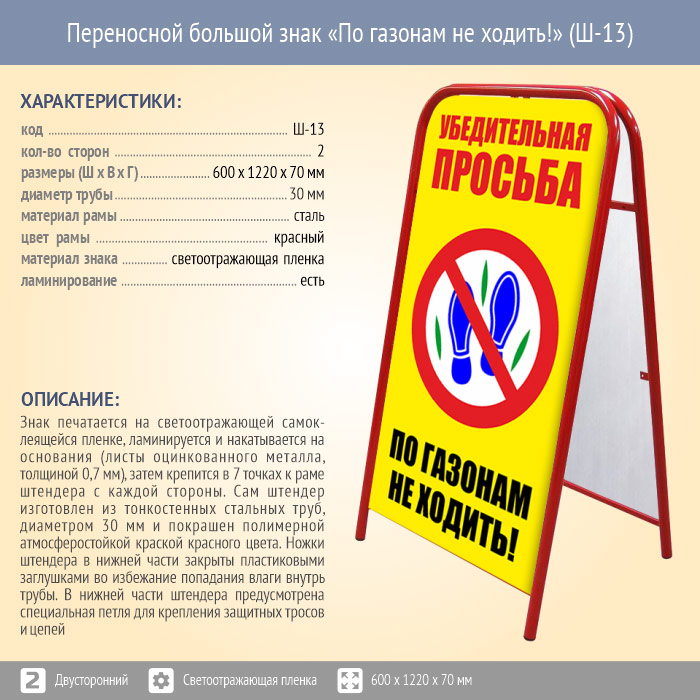 Переносной большой знак «По газонам не ходить!» (Ш-13, двусторонний, светоотражающая пленка) в Волгограде купить