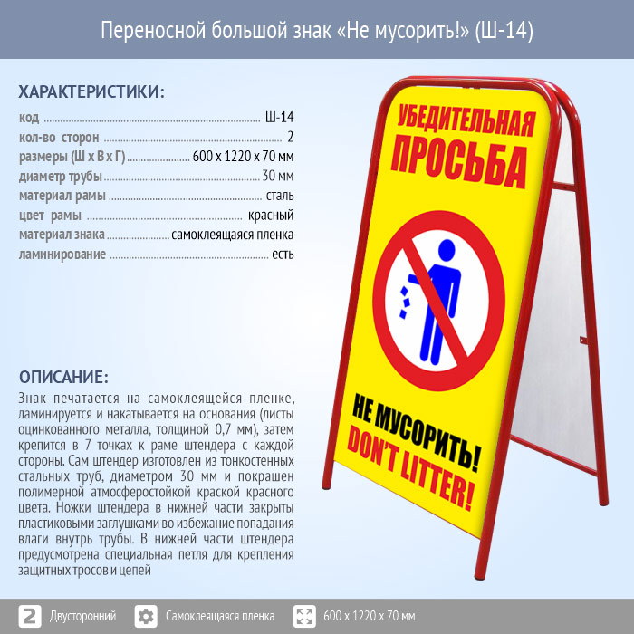 Переносной большой знак «Не мусорить!» (Ш-14, двусторонний, самоклеящаяся пленка) в Волгограде купить