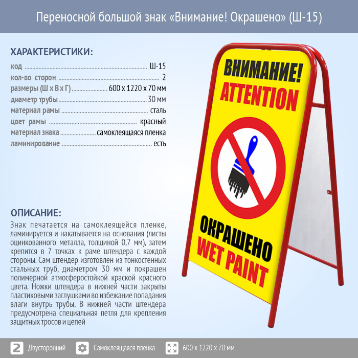 Переносной большой знак «Внимание! Окрашено» (Ш-15, двусторонний, самоклеящаяся пленка) в Волгограде купить