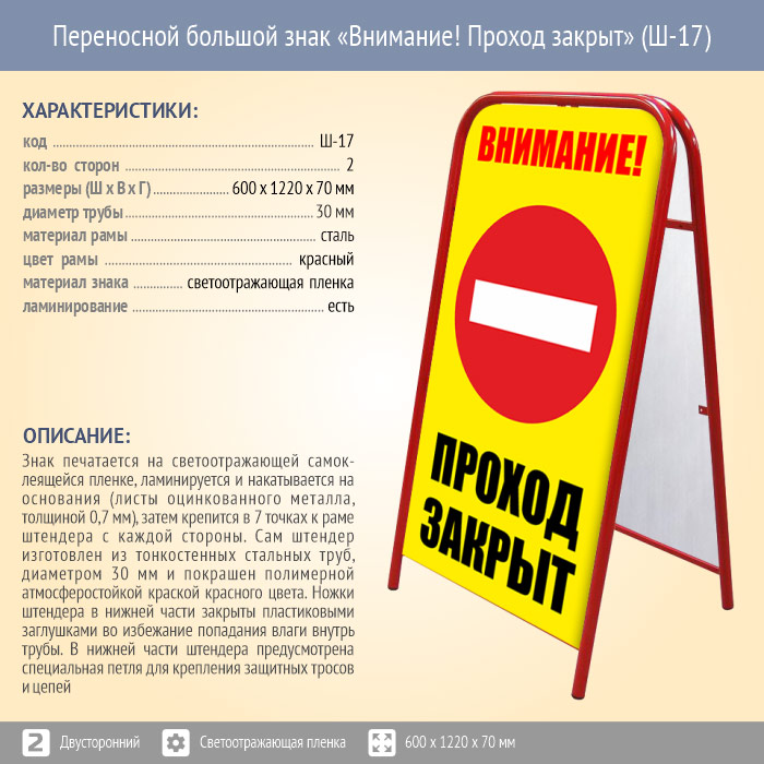 Переносной большой знак «Внимание! Проход закрыт» (Ш-17, двусторонний, светоотражающая пленка) в Волгограде купить