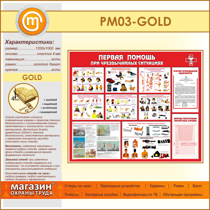 Стенд «Первая помощь при чрезвычайных ситуациях» с плоским и объемным карманами (PM-03-GOLD) в Волгограде купить