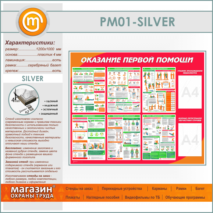 Стенд «Оказание первой помощи» с плоским и объемным карманами (PM-01-SILVER) в Волгограде купить