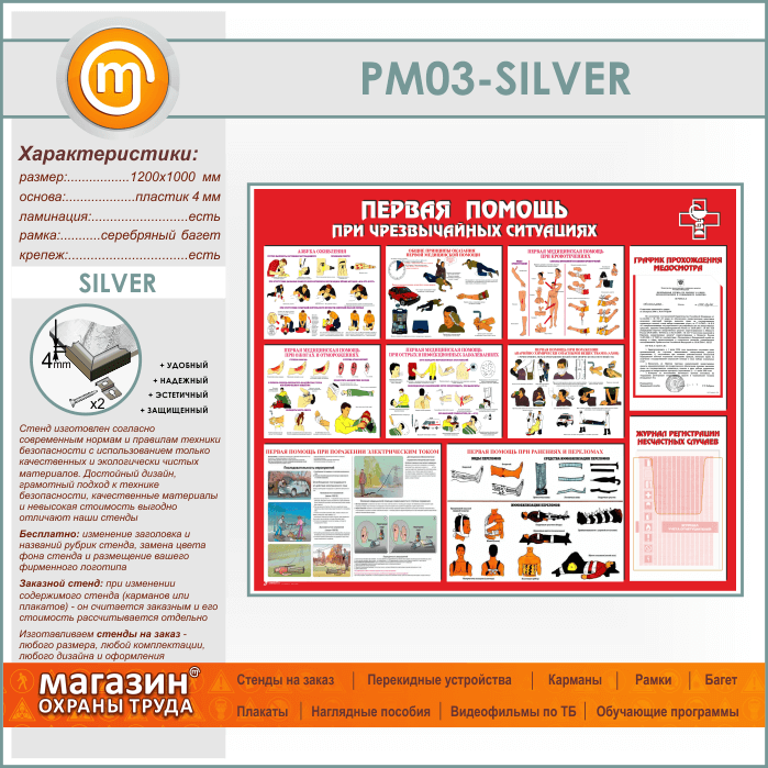 Стенд «Первая помощь при чрезвычайных ситуациях» с плоским и объемным карманами (PM-03-SILVER) в Волгограде купить