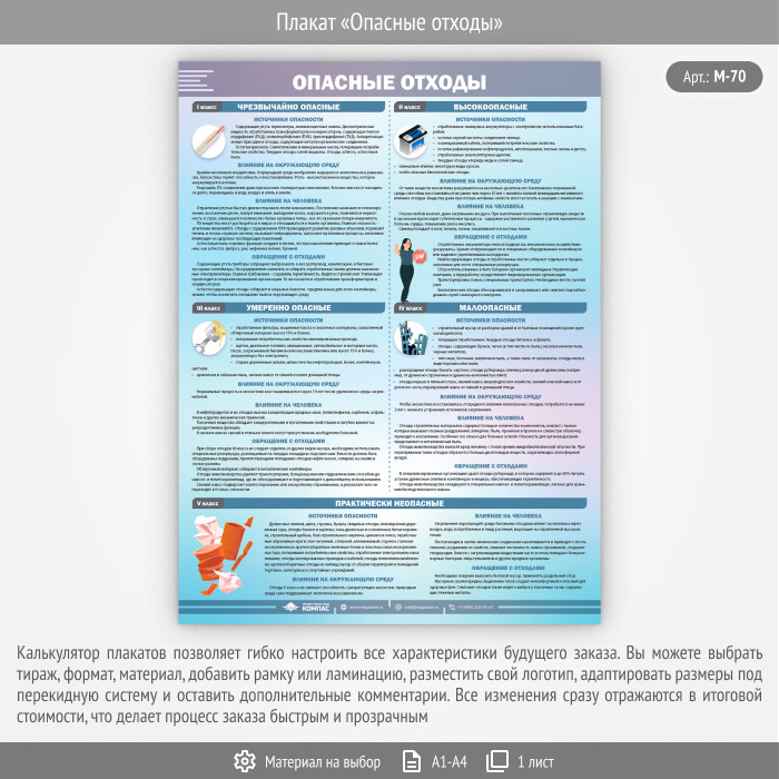 Плакат «Опасные отходы» (М-70) содержит классификацию отходов по степени воздействия на окружающую среду и человека. Рассказывает об источниках, содержащих опасные отходы и обращении с ними