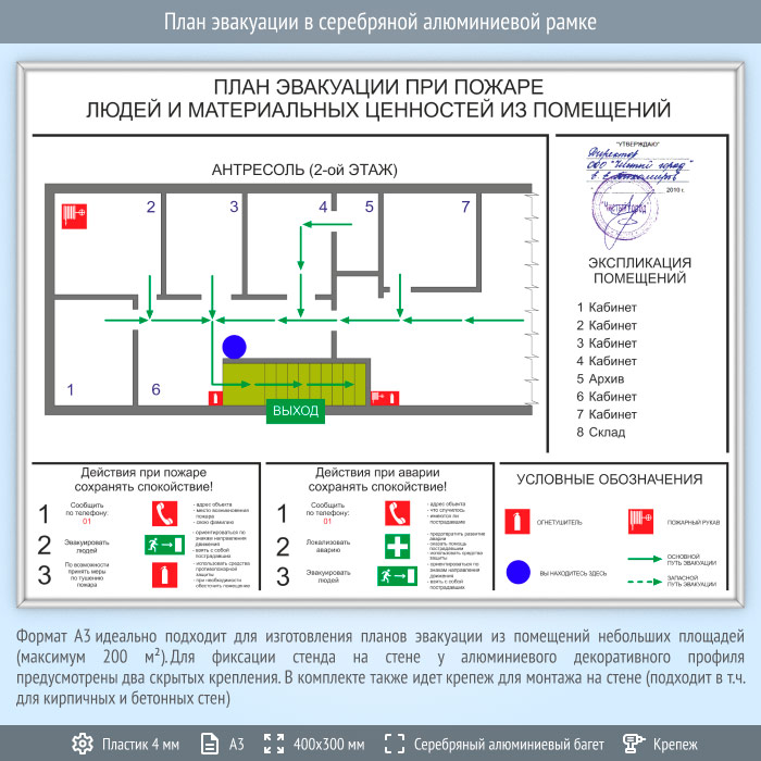 План эвакуации в серебряной алюминиевой рамке (А3 формат) в Волгограде купить
