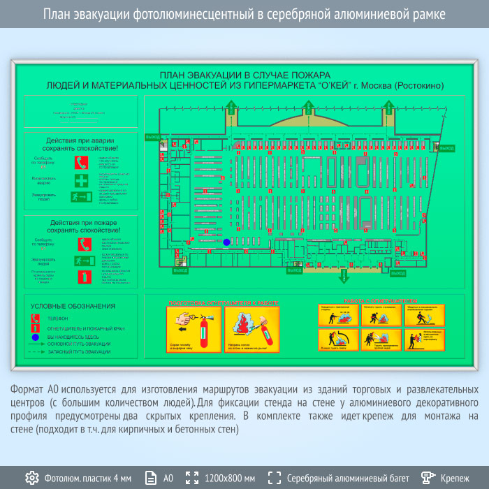 План эвакуации фотолюминесцентный в серебряной алюминиевой рамке (А0 формат) в Волгограде купить
