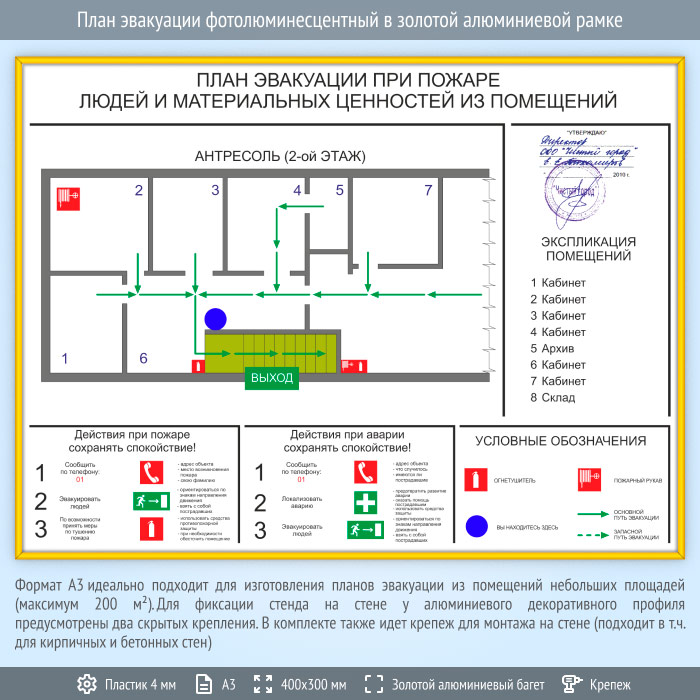 План эвакуации в золотой алюминиевой рамке (А3 формат) в Волгограде купить