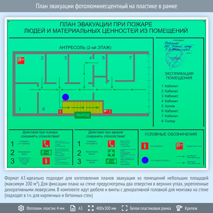 План эвакуации фотолюминесцентный на пластике в рамке (А3 формат) в Волгограде купить
