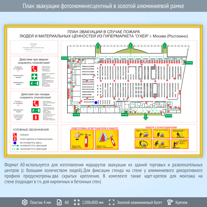 План эвакуации в золотой алюминиевой рамке (А0 формат) в Волгограде купить