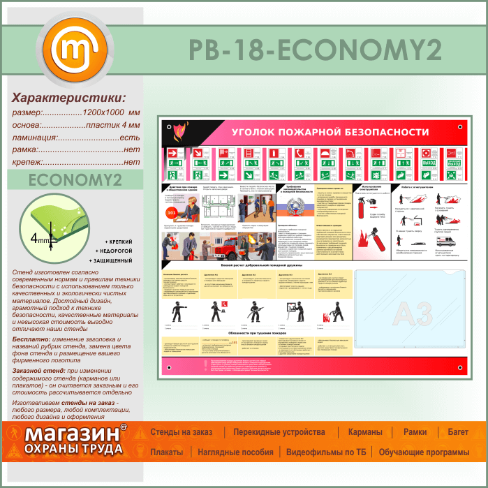 Стенд «Уголок пожарной безопасности» с карманом А3 формата (PB-18-ECONOMY2) в Волгограде купить
