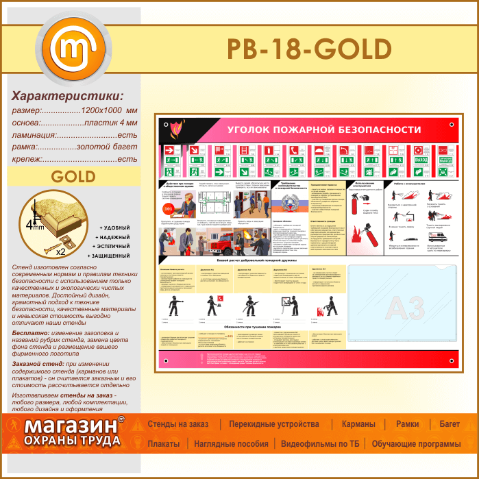 Стенд «Уголок пожарной безопасности» с карманом А3 формата (PB-18-GOLD) в Волгограде купить