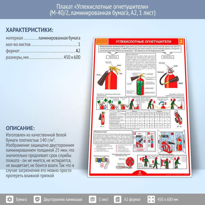 Плакат «Углекислотные огнетушители» (М-40/2, ламинированная бумага, А2, 1 лист) в Волгограде купить