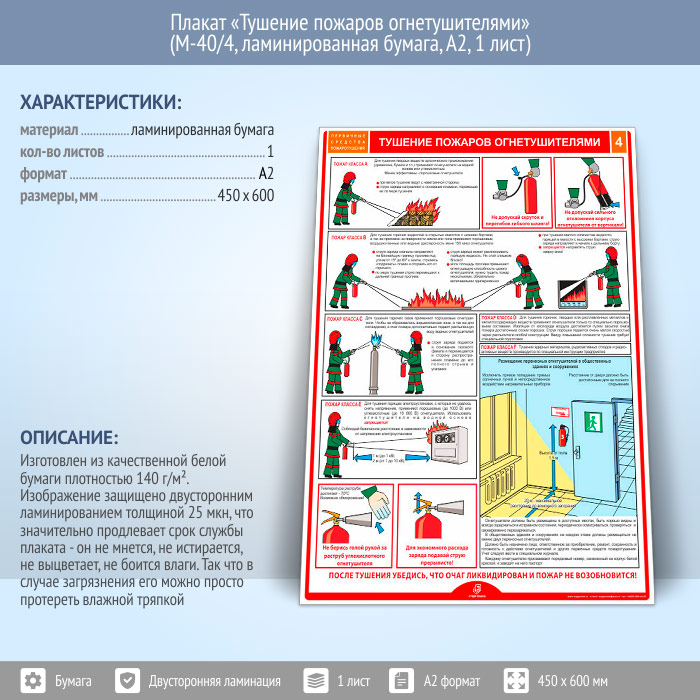 Плакат «Тушение пожаров огнетушителями» (М-40/4, ламинированная бумага, А2, 1 лист) в Волгограде купить