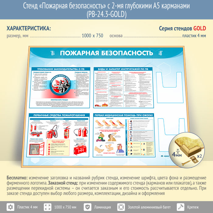 Стенд «Пожарная безопасность» с 2-мя глубокими А5 карманами (PB-24.3-GOLD) в Волгограде купить
