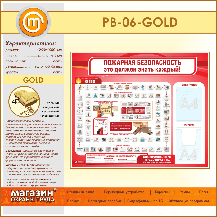 Стенд «Пожарная безопасность. Это должен знать каждый» с плоским и объемным карманами (PB-06-GOLD) в Волгограде купить