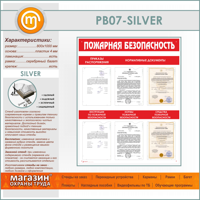 Стенд «Пожарная безопасность» с 6 карманами (PB-07-SILVER) в Волгограде купить