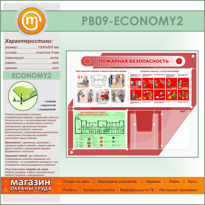 Стенд «Пожарная безопасность» с планом эвакуации, плоским и объемным карманами (PB-09-ECONOMY2) в Волгограде купить