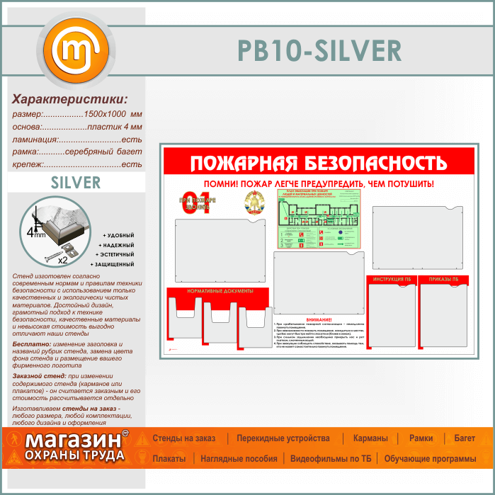 Стенд «Пожарная безопасность» с планом эвакуации, 5 плоскими и 3 объемными карманами (PB-10-SILVER) в Волгограде купить