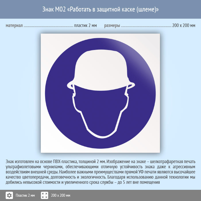 Знак M02 «Работать в защитной каске (шлеме)» (пластик, 200х200 мм) в Волгограде купить