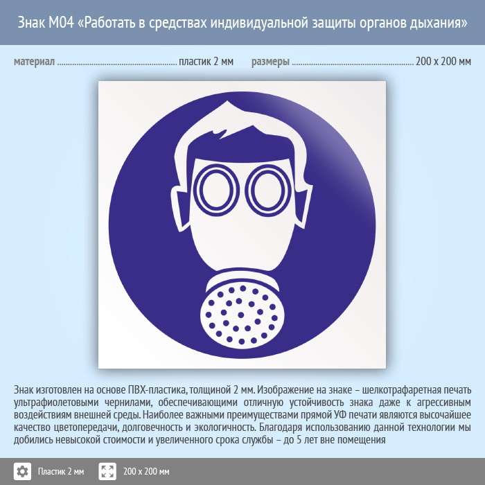 Знак M04 «Работать в средствах индивидуальной защиты органов дыхания» (пластик, 200х200 мм) в Волгограде купить