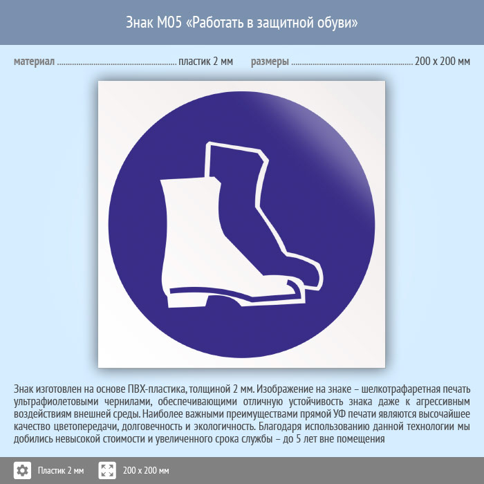 Знак M05 «Работать в защитной обуви» (пластик, 200х200 мм) в Волгограде купить