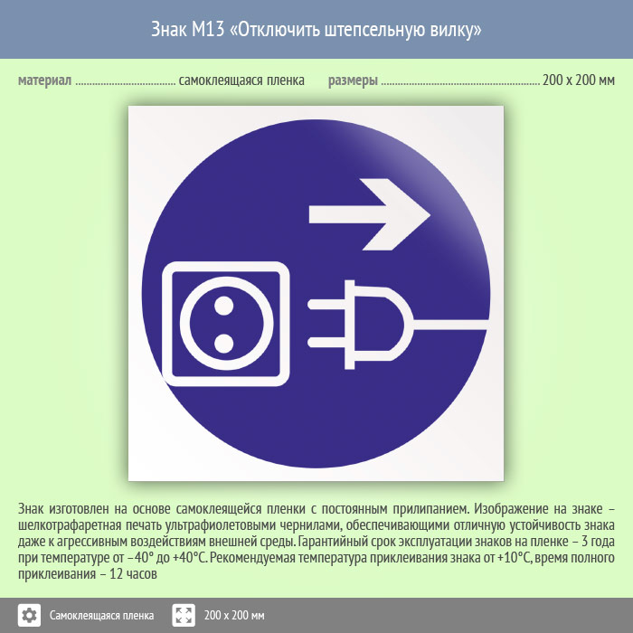 Знак M13 «Отключить штепсельную вилку» (пленка, 200х200 мм) в Волгограде купить