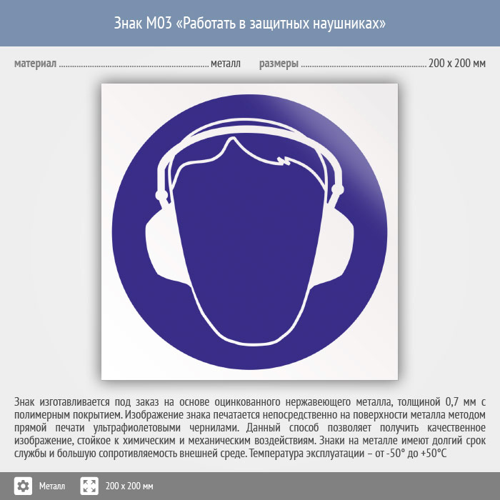 Знак M03 «Работать в защитных наушниках» (металл, 200х200 мм) в Волгограде купить