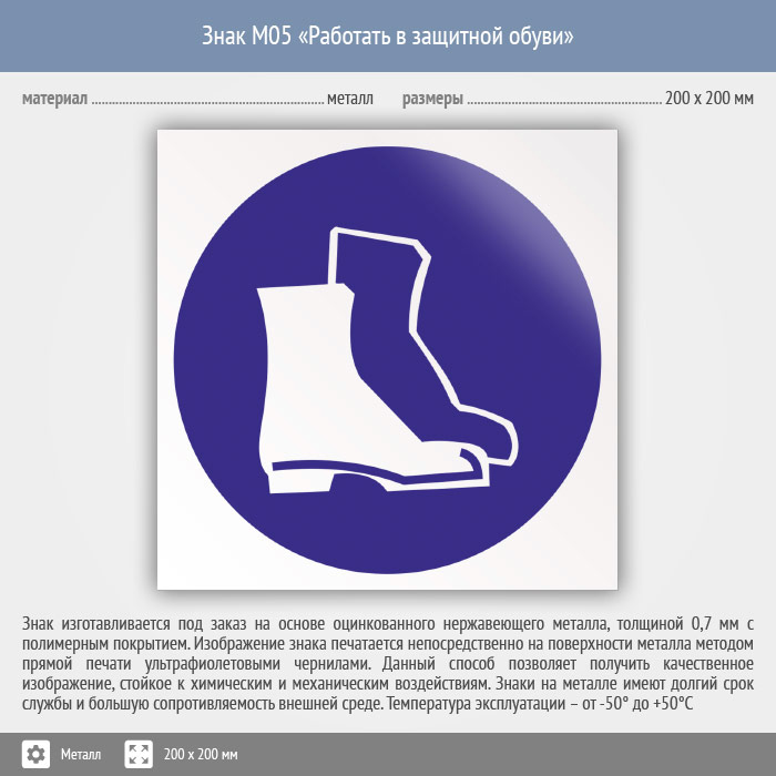 Знак M05 «Работать в защитной обуви» (металл, 200х200 мм) в Волгограде купить