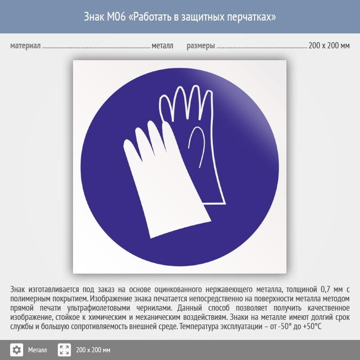 Знак M06 «Работать в защитных перчатках» (металл, 200х200 мм) в Волгограде купить