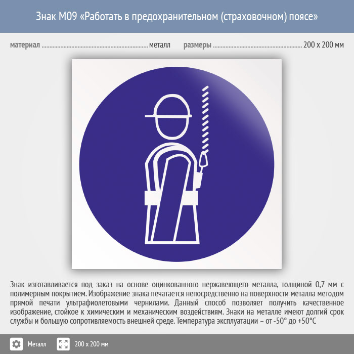 Знак M09 «Работать в предохранительном (страховочном) поясе» (металл, 200х200 мм) в Волгограде купить