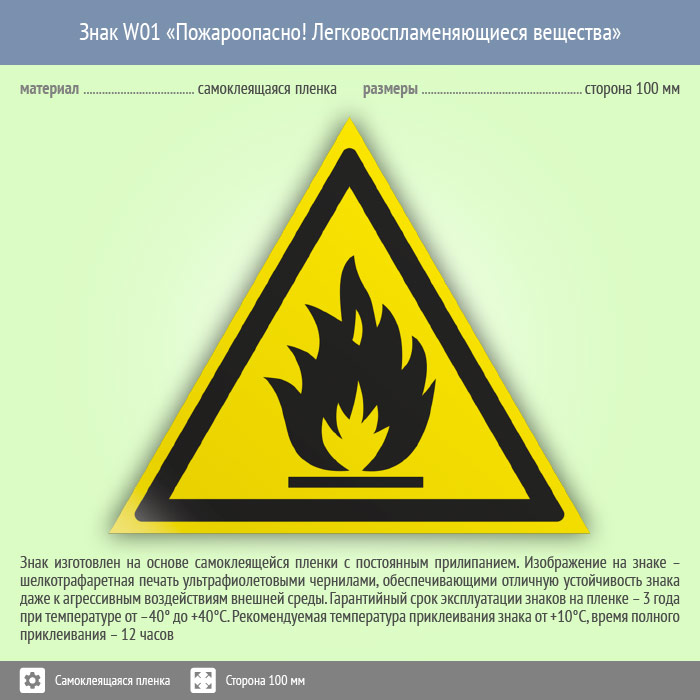 Знак W01 «Пожароопасно! легковоспламеняющиеся вещества» (пленка, сторона 100 мм) в Волгограде купить