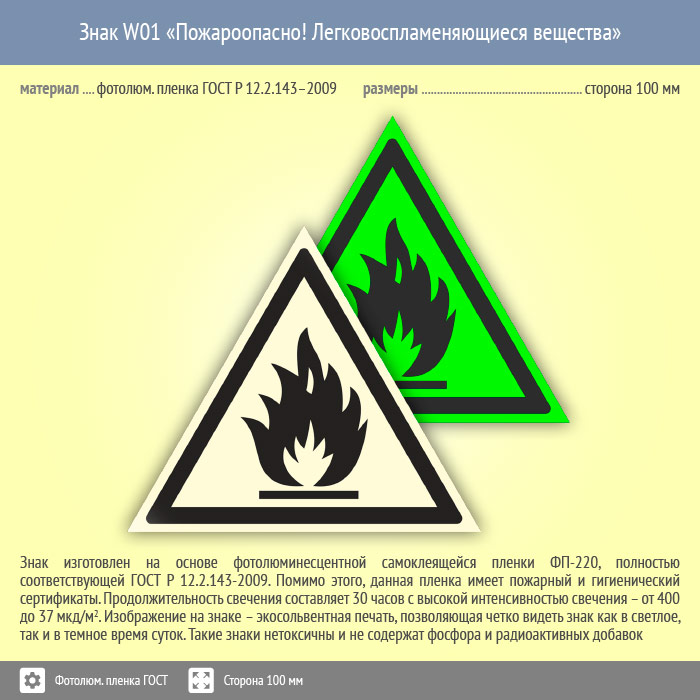 Знак W01 «Пожароопасно! легковоспламеняющиеся вещества» (фотолюминесцентная пленка ГОСТ 34428-2018, сторона 100 мм) в Волгограде купить