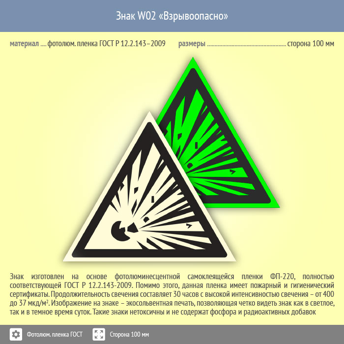 Знак W02 «Взрывоопасно» (фотолюминесцентная пленка ГОСТ 34428-2018, сторона 100 мм) в Волгограде купить